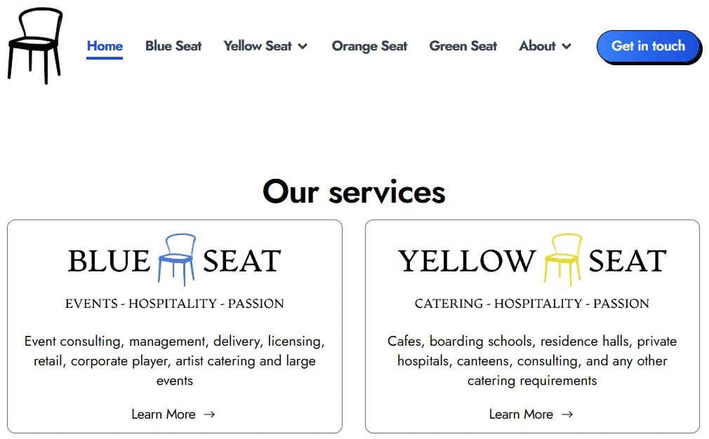 Blue Seat / Yellow Seat / Orange Seat / Green Seat are a set of businesses offering services such as catering, cleaning and event management.